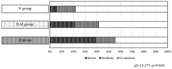 In the N group, 29 of 37 patients (78.4%) reported no changes in their food intake in the last 3 months before admission. However, the rate of patients who reported no changes in their food intake decreased in the P-M (44/75, 58.7%) and D (16/36, 44.4%) groups. Conversely, severe decreases in food intake in the N group were observed only in a small percentage of the individuals (2/37, 5.4%), whereas the rate of participants who reported severe decreases in food intake escalated in the D group (14/36, 38.9%), with the groups showing statistically significant differences (p = 0.010, Figure 2). The proportion of patients with moderate decreases in food intake was similar across the three groups.