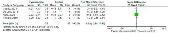 Figure 3 illustrates the effects of the ketogenic diet on IL-6 levels over time. In this case, a not statistically significant decrease was detected, although the analyzed studies were only two (mean of −1.31 pg/mL (95% CI: −2.86, 0.25)).