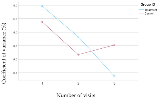 A consistent and significant reduction was observed in %CV from the baseline (mean change= 2.6%, p= 0.01) for the treatment group; however, the changes in %CV were not statistically significant for the control group. The mean changes in the %CV for both groups are depicted in Figure 1.