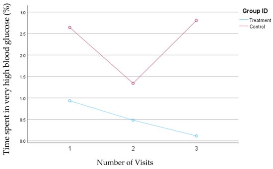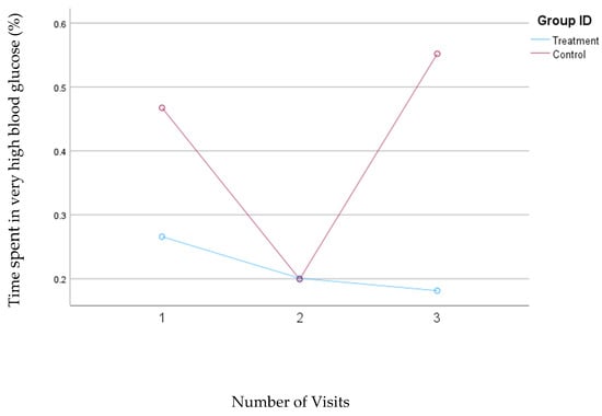 Based on the results of the first model, which defined blood glucose concentrations above 250 mg/dL as very high, the treatment group consistently reduced the percentage of time spent in the very high blood glucose range from 0.27% to 0.18%. In contrast, in the control group, the percentage of time spent in the very high blood glucose range decreased from 0.47% at visit one to 0.20% at visit two but then increased to 0.55% at visit three. There were no statistically significant changes in the percentage of time spent in the very high blood glucose range in either group. However, the reduction was consistent in the treatment group, while the control group showed variability during this study. Figure 2 illustrates the changes in the percentage of time spent with blood glucose levels exceeding 250 mg/dL for both groups.