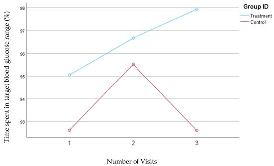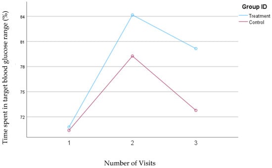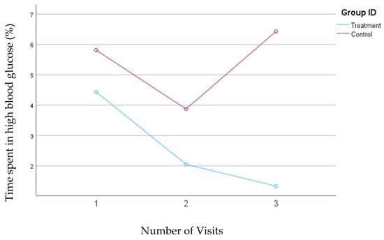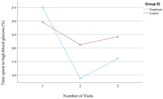 In the second model, where high blood glucose levels were defined as concentrations between 140 and 200 mg/dL, the treatment group demonstrated a significant reduction in the percentage of time spent in this high glucose range from visit one to visit two (from 27.5% to 14.37%; p = 0.004). However, there was a slight, nonsignificant increase to 18.1% from visit two to visit three. Conversely, the control group also showed a decrease in the percentage of time spent in the high blood glucose range from visit one (24.8%) to visit two (20.6%) but experienced a subsequent increase to 22.1% from visit two to visit three. Despite a slight increase in the percentage of time spent in high blood glucose range from visits two to three in the treatment group, the overall interaction between time and intervention remained significant for the treatment group (p = 0.04) during this study, whereas it was not significant for the control group. Figure 5 depicts the mean changes in the percentage of time spent in the high blood glucose range for the treatment and control groups.