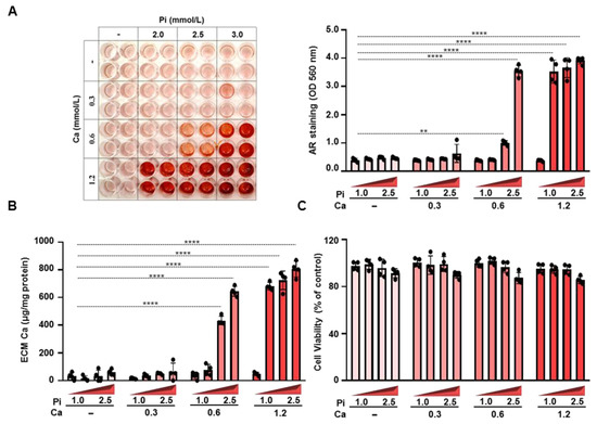 The mechanisms of osteogenic differentiation in BMSCs and osteoblastic trans-differentiation in VSMCs exhibit similarities including common triggers. We exposed to BMSCs to an osteogenic medium containing different concentrations of excess phosphate (0–3.0 mmol/L) and Ca (0–1.2 mmol/L) for 5 days. Alizarin Red staining revealed that while Pi and Ca alone did not induce ECM mineralization, when these triggers were applied together, a dose-dependent mineralization of the ECM occurred, suggesting a synergistic effect of Pi and Ca in inducing calcification (Figure 1A,B). PiCa treatment did not influence cell viability, which was assessed by an MTT assay (Figure 1C). Based on these results, we used an osteogenic medium supplemented with 2.5 mmol/L Pi and 0.6 mmol/L Ca to induce the osteogenic differentiation of BMSCs throughout this paper.