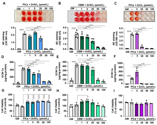 Zinc inhibits the PiCa-induced mineralization of BMSCs in a dose-dependent manner. Confluent BMSCs (passage 4–6) were cultured under control (Ctrl) or osteogenic conditions (2.5 mmol/L Pi, and 0.6 mmol/L Ca, PiCa) or OBM medium in the presence or absence of ZnSO4 or ZnCl2 (1–100 µmol/L) for 5 days. (A–C) Ca deposition as a readout of ECM mineralization was visualized by Alizarin Red staining. Representative images of stained plates are shown (n = 4–5). (D–F) The Ca content of HCl-solubilized ECM is shown. Results are expressed as the mean ± SD, n = 4–5. (G–I) Cell viability was determined by an MTT assay after 5 days of treatment. Data represent the mean ± SD, n = 4–5. Ordinary one-way ANOVA followed by Tukey’s multiple comparison test were used to calculate p values. * p < 0.05, ** p < 0.01, *** p < 0.005, **** p < 0.001. Two additional experiments yielded similar results.