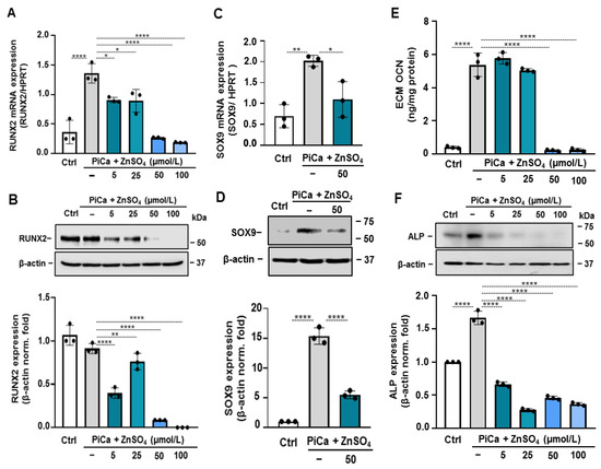 Zinc inhibits the PiCa-induced upregulation of RUNX2, SOX9, OCN, and ALP. Confluent BMSCs (passage 6–8) grown in six-well plates were treated with osteogenic stimuli supplemented with zinc at the indicated concentrations (0–100 µmol/L) for 3 days. (A,C) RUNX2 and SOX9 mRNA levels were determined by real-time RT-PCR. (B,D,F) Protein expression of RUNX2, SOX9, and ALP was determined from whole cell lysates. Membranes were re-probed for β-actin. Representative Western blots and the relative expression of RUNX2, SOX9, and ALP normalized to β-actin from three independent experiments are shown. Results are presented as the mean ± SD of three independent experiments performed in triplicate. * p < 0.05, ** p < 0.01, **** p < 0.001. (E) OCN levels were determined in EDTA-solubilized ECM samples by ELISA (day 5). Results are presented as the mean ± SD of three independent experiments performed in triplicate.