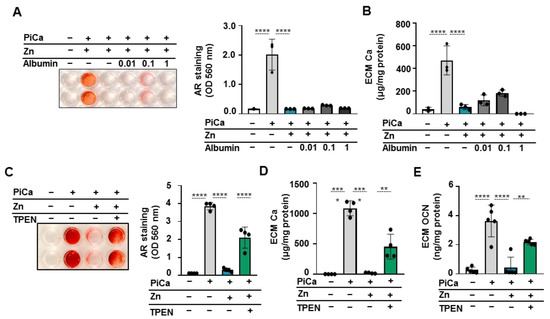 It has been reported that serum albumin is the major zinc carrier in the blood and is responsible for its systemic distribution Approximately 75–80% of plasma zinc is bound to albumin [24]. To evaluate whether albumin influences the zinc-mediated inhibition of the osteogenic differentiation of BMSCs, we cultured the cells in PiCa in the presence or absence of zinc (50 µmol/L) and albumin (0.01–1 mg/mL). Alizarin Red staining and quantitative calcium analysis showed that zinc significantly attenuated calcium deposition in BMSCs at day 5 and albumin did not alter the inhibitory effect of zinc on BMSCs mineralization in any concentration range (Figure 4A,B). Previous studies showed that zinc inhibits human valve interstitial cell calcification in vitro, and this inhibitory effect is eliminated by the zinc chelator TPEN [25]. Therefore, to investigate whether the inhibitory effect of zinc on BMSCs osteogenesis was specifically due to free zinc ions, a specific intracellular zinc chelator TPEN was used. Alizarin Red staining, quantitative calcium analysis, and the OCN level revealed that 10 µmol/L of TPEN significantly reversed the inhibitory effect of 50 µmol/L of zinc (Figure 4C–E). Taken together, these data suggest that non-chelated zinc inhibits BMSC mineralization.