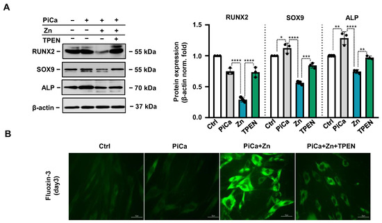 TPEN attenuates the inhibitory effect of zinc on the PiCa-induced upregulation of RUNX2, SOX9, and ALP and prevents intracellular zinc accumulation in BMSCs. (A) RUNX2, SOX9, and ALP expressions were determined from whole cell lysates (day 3). Membranes were re-probed for β-actin. Representative Western blots and relative expression of RUNX2, SOX9, and ALP normalized to β-actin from three independent experiments are shown. * p < 0.05, ** p < 0.01, *** p < 0.005, **** p < 0.001. (B) Representative images of Fluozin-3 staining at day 3. Scale bar 50 µm. Data are expressed as the mean ± SD of three independent experiments performed in triplicate.