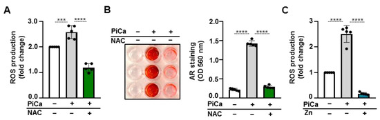 It has been shown that zinc supplementation decreases reactive oxygen species (ROS) production in vitro [27] through the upregulation of ROS scavenger proteins, which mechanism was proposed in the zinc-induced inhibition of VSMC calcification [28,29,30]. Considering that zinc affects ROS generation and that ROS are recognized as a critical factor in the osteogenic differentiation of BMSCs, we next examined the effect of osteogenic stimuli on ROS levels in the presence or absence of an ROS scavenger NAC and zinc. PiCa stimulation increased ROS generation in BMSCs compared to non-stimulated cells (Figure 7A). NAC at the dose of 0.5 mmol/L completely inhibited the PiCa-mediated excessive production of ROS (Figure 7A,B). Then, we investigated whether scavenging excess ROS can prevent PiCa-induced BMSC calcification. Alizarin Red staining revealed that mineralization did not occur in the presence of NAC (0.5 mmol/L) (Figure 7B). Finally, we observed that zinc, similar to NAC, inhibits the PiCa-induced increase in ROS production (Figure 7C), which could explain the anti-osteogenic effect of zinc.