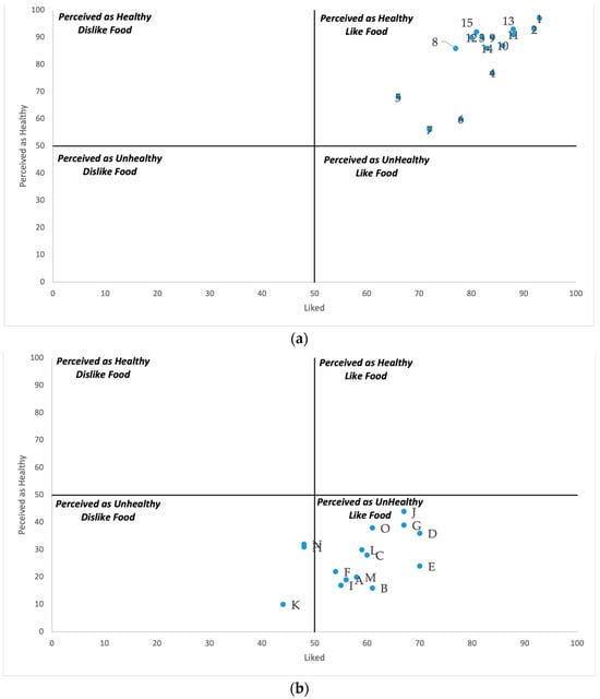 The study used a scatter plot to visualize the responses of Filipino school-aged children on the HULD questionnaire. It assesses various food items based on two criteria: how much the food is liked (x-axis), and how healthy the food is perceived (y-axis). As shown in Figure 1a, “healthy food items” such as (1) milk, (2) rice, (3) malunggay/moringa, (9) carrots, (10) mango, (11) corn, (12) boiled sweet potato, (13) apple, (14) nuts, (15) eggplant were classified by the school-aged children as both healthy and liked. Most healthy food items fall in this category, showing a strong positive perception of these foods. Although they belong to the same quadrant, food items such as (5) fish, (4) chicken egg, (6) chicken meat, (8) string beans, (7) pork meat are placed near the center of the graph, indicating a more neutral perception. They are neither strongly liked nor intensely disliked, and their perceived health benefits are moderate. It would be interesting to explore this area further. Moreover, as shown in Figure 1b, “unhealthy food items” such as (A) cake, (B) ice cream, (C) instant noodles, (D) French fries, (E) donuts, (F) soft drinks, (G) flavored juice, (I) chips, (J) bacon, (L) pork chops, (M) ice drops, and (O) fishballs were perceived by the school-aged children as unhealthy, but that they liked the food, while (H) instant coffee, (N) energy drinks, and (K) lollipops were perceived as unhealthy and disliked foods, indicating that they are not as strongly liked as the other unhealthy food items. The scatter plot offers valuable insights into Filipino school-aged children’s food knowledge and food choices.