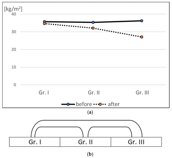 (a) BMI values of patients in three groups before and after BIB surgery and weight loss diets. (b) Incidence of statistically significant differences between the obtained BMI values of patients in the three groups after BIB surgery and weight loss diets.