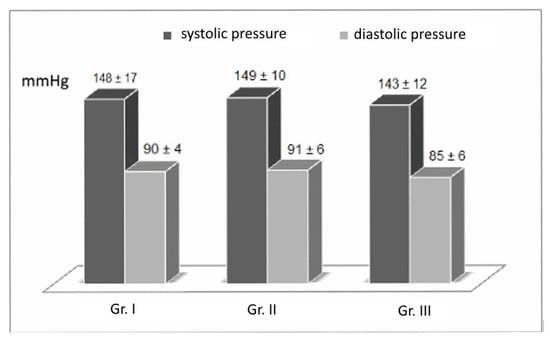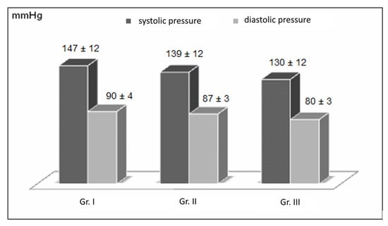 Blood pressure values of patients in the three groups before BIB treatment. Group I—control; Group II—receiving the standard diet; and Group III—receiving the modified diet.