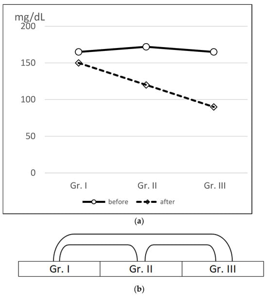 (a) Mean triglyceride levels of patients in the three groups before and after BIB surgery and weight loss diets. (b) Incidence of statistically significant differences between the achieved triglyceride levels of patients in the three groups after BIB surgery and weight loss diets.