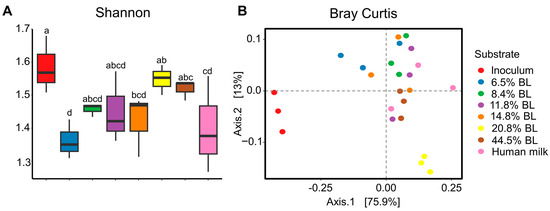 (A) Shannon diversity index after 24 h of in vitro colon simulated fermentations using infant fecal inoculum. (B) Bray-Curtis based dissimilarity metrics based depiction of GM differences between inoculum and after 24 h in vitro simulated colonic passage. The percentage of BL represents different levels of blocked lysine in infant formulas. t-test was used to assess the alpha diversity index. p < 0.05 was regarded as a statistically significant difference and labeled with different letters.