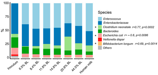 Microbiome composition of in vitro simulated colonic fermentations after 24 h, using infant formula with different glycation levels and human milk as substrates. The composition of the initial inoculum is shown for comparison. Species level of the 15 most abundant species. % BL represents the different levels of blocked lysine in the infant formula samples. Spearman correlation test was used to assess the correlation between the abundance of the taxa and glycation levels. Significant correlations (p < 0.05) are marked with an asterisk, “r”: correlation coefficient.