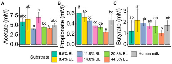Acetate (A), propionate (B), and butyrate (C) levels (mM) after 24 h fermentation with infant’s feces. % BL represents different levels of blocked lysine in infant formulas. t-test was used to compare the mean values of metabolites among the different substrates. p < 0.05 was regarded as a statistically significant difference and labeled with different letters.