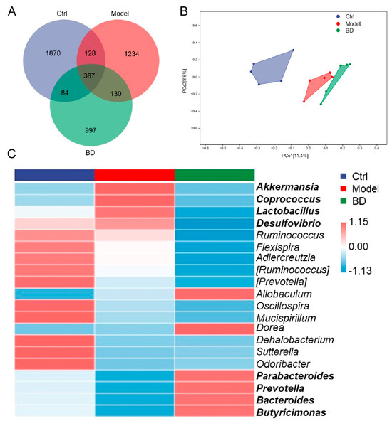 The impact of BD on the intestinal microbiota in CAC mice. (n = 4) (A) Venn diagram. (B) PCoA based on weighted UniFrac distances. (C) Heatmap illustrating the composition of the top 20 most advantageous genera.