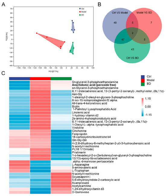 The OPLS-DA score map showed that the metabolite levels of mice in each group changed significantly after the treatments (Figure 4A). A total of 149 distinct metabolites were identified. Among these, 94 exhibited significant differences between the model mice and the Ctrl mice, while 19 showed notable variations between the model mice and the BD-treated mice (Figure 4B). A heatmap analysis of differential metabolites was conducted, demonstrating that the serum levels of 26 metabolites in the BD-treated mice were significantly decreased. These metabolites included arachidonic acid, linolenic acid, cinchonine, fenpropidin, and vindoline (Figure 4C). BD treatment resulted in upregulated levels of 11 metabolites, including L-Asparagine, 5-aminovaleric acid, L-Tryptophan, D-Quinovose, and acetylcarnitine (Figure 4C).