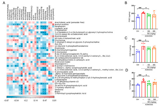 (A) The associated heatmap of significantly altered metabolites and genus microbiota. (B) PGE2, (C) COX-2, (D) IL-6 in CAC mice colon. ### p < 0.001 vs. Ctrl group; * p < 0.05 vs. model group.