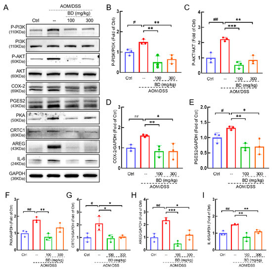 To elucidate the relationship between the relieving effect of BD on CAC and the PI3K/AKT/COX-2 pathway, we assessed the relevant proteins. Compared to the Ctrl mice, the levels of P-PI3K, P-AKT, COX-2, and PGES2 in the colon of CAC mice demonstrated significant increases of 50% (p < 0.05), 122.9% (p < 0.01), 60.2% (p < 0.01), and 31.9% (p < 0.05), respectively. (Figure 6A–E). The levels of PKA, CRTCI, AREG, and IL-6 exhibited increases of 78.9% (p < 0.01), 109.8% (p < 0.05), 134.7% (p < 0.01), and 51.6% (p < 0.01), respectively (Figure 6A,F–I). Compared to CAC mice, the levels of P-PI3K, P-AKT, COX-2, and PGES2 in the colon of mice treated with 100 mg/kg BD were reduced by 66.6% (p < 0.01), 75.8% (p < 0.001), 47.7% (p < 0.01), and 47.5% (p < 0.01), respectively (Figure 6A–E). The levels of PKA, CRTCI, AREG, and IL-6 exhibited increases of 56.6% (p < 0.01), 55.3% (p < 0.05), 78% (p < 0.001), and 49.1% (p < 0.01), respectively (Figure 6A,F–I). Compared to CAC mice, the levels of P-PI3K, P-AKT, COX-2, and PGES2 in the colon of mice treated with 300 mg/kg BD were reduced by 56.4% (p < 0.01), 61.1% (p < 0.01), 47.8% (p < 0.05), and 46.3% (p < 0.05), respectively (Figure 6A–E). The levels of PKA, CRTCI, AREG, and IL-6 exhibited increases of 25.6%, 49.8% (p < 0.05), 48.8% (p < 0.05), and 27.4% (p < 0.01), respectively (Figure 6A,F–I).