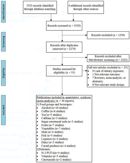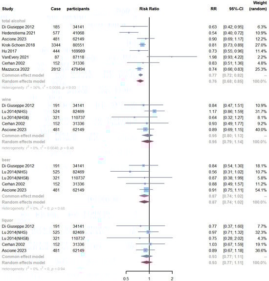 Ten prospective studies were included in the meta-analysis for the consumption of alcohol (nine reports) [,,,,,,,,], five studies for wine (four reports) [,,,], five for beer (four reports) [,,,], five for liquor (four reports) [,,,], six for total coffee [,,,,,], four for caffeinated coffee [,,,], five for decaffeinated coffee [,,,,], five for tea [,,,,], three for caffeine [,,], three for sugar-sweetened soda (two reports) [,], seven for fruits (six reports) [,,,,,], seven for vegetables (six reports) [,,,,,], four for total meat [,,,], three for red meat [,,], two for processed meat [,], three for poultry [,,], five for total fish (four reports) [,,,], three for oily fish [,,], two for legumes [,], three for total dairy [,,], two for milk [,], two for cheese [,], four for cereal products (three reports) [,,], four for n-3 PUFAs (three reports) [,,], four for vitamin C (three reports) [,,], four for vitamin D (three reports) [,,], three for vitamin D supplements (two reports) [,], three for vitamin A (two reports) [,], four for vitamin E (three reports) [,,], and three for carotenoids (two reports) [,] (Supplementary Table S7a,b).