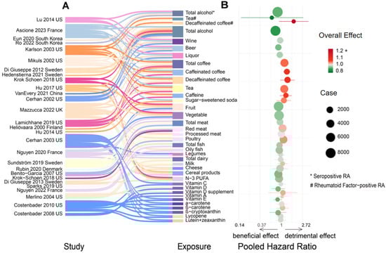 This is the first comprehensive meta-analysis of the associations between RA risk in adults and the consumption of a range of foods, beverages, and nutrients, conducted to concurrently examine the potential protective and harmful effects of diet on RA risk in a dose-specific association.