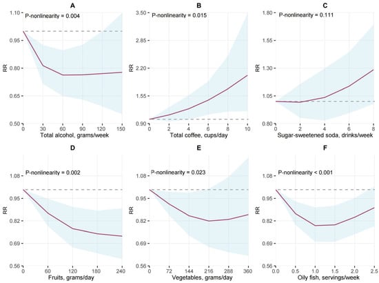 Non-linear dose–response association of food component consumption with risk of RA using restricted cubic splines. Relations for food components of (A) total alcohol, (B) total coffee, (C) sugar-sweetened soda, (D) fruits, (E) vegetables, and (F) oily fish. Solid lines represent the fitted non-linear trend and blue shade represents the pointwise 95% CIs.