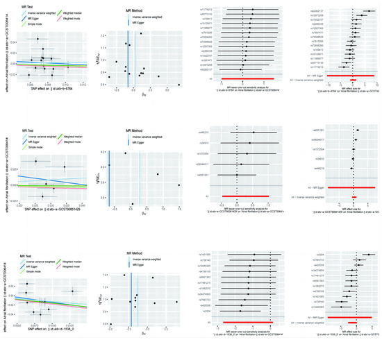For the effect of physical activity on AF, MR-Egger’s analysis showed an OR of 0.4451, 95% CI of 2.85 × 10−5 to 6954.7211, a p-value of 0.8723, and a Beta value of −0.8093, which suggests that there is no significant causal relationship between physical activity and AF. The results of the weighted median method showed an OR of 0.7115 with a 95% CI of 0.2823 to 1.7930, a p-value of 0.4704, and a Beta value of −0.3404, which also failed to show a significant causal relationship. Analysis of the inverse variance weighting method showed an OR of 1.2707, 95% CI of 0.3696 to 4.3686, a p-value of 0.7038, and a Beta value of 0.2396, again failing to demonstrate the significant effect of physical activity on AF.