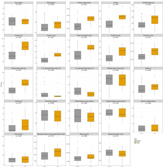In the PC group, male patients had a higher caloric intake, but there was no difference in the ratio. Male patients had a higher fat intake (g) (94 vs. 64g; p = 0.008), whereas female patients had a significantly higher intake of n-6-saturated fatty acids (4.5 vs. 5.2%; p = 0.036). There were no differences in the composition of saturated and unsaturated fat intake composition in the HC group. Male patients with fatigue had a higher protein intake in g but not in percentage. In addition, intakes of vitamins B1, B6, B12, niacin equivalents, sodium, phosphorus, and zinc intake were significantly higher in male patients (see Supplementary Table S3 for details). These findings were also observed in the HC group, so they may not be specific to post-COVID patients, but further differences in intake were observed in the HG group. Males also had a higher uptake of vitamin K, vitamin B2, potassium, calcium, magnesium, and copper, as well as cholesterol and alcohol. Healthy women had a higher percentage intake of sucrose. There was no difference detectable in activity or sleep duration in the PC group, but male participants in the HC group had a higher measured active energy expenditure.
