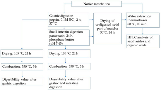 Instead of catechins, amino acids and caffeine tea leaves contain organic acids and saccharides that interact in complex ways to form the unique taste of tea [13]. Phenolic substances, amino acids and xanthine alkaloids have already been described in the literature [19,29]; for this reason, the purpose of our study was to analyze the contents and digestibility of other analytes participating in the taste profile of matcha tea.