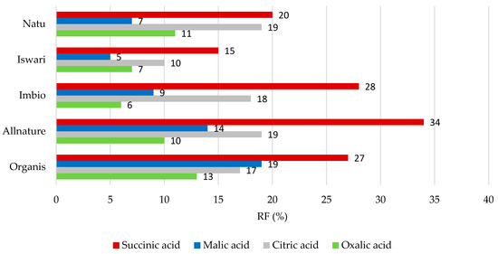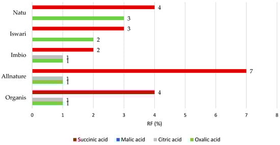 Focused on digestion in the stomach and small intestine (Figure 3), the highest RF value was obtained in the case of succinic acid where the RF value reached up to 7%. The order from least- to most-released organic acid is as follows: succinic > oxalic > citric > and malic acids. It should be emphasized that approximately 93% of succinic acid is theoretically available for absorption in the digestive tract, and up to 7% of its concentration remains bound in matcha tea leaves and passes into the large intestine. Conversely, malic acid is completely released from the matrix of the tea leaf after the digestion process (the RP value is 0%). In the measurement of oxalic acid, a retention factor of up to 3% was calculated, while for citric acid it was evaluated only for three out of five matcha tea samples. In concrete terms, citric acid was completely released from the matrix of the Natu and Iswari samples that originated in Japan.