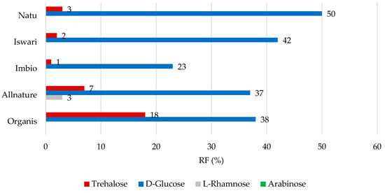 Focusing on the low molecular weight carbohydrates in matcha tea, scarce information has been reported. Table 5 shows the concentrations of the individual sugars measured in the native portion of matcha tea. D-fructose, xylose, maltose, and saccharose were not observed in all analyzed matcha tea samples, indicating their absence or their amounts were below their LOQ limit. In addition, Organis and Allnature matcha samples were poor in L-arabinose concentrations, but these were the only samples in which L-rhamnose occurred.