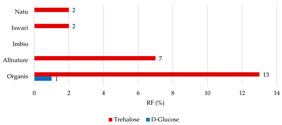 Although the highest RF values for D-glucose were found after gastric digestion, this statement cannot be applied to the simulation of the digestion process in the stomach and small intestine (Figure 5). D-glucose was completely released from green tea leaves, and the only 1% remaining was still captured in the Organis tea sample. On the contrary, trehalose was not completely released from matcha and even 13% of trehalose can still remain in tea leaves, which means that 87% of trehalose is available for digestion. Data concerning the bioaccessibility of saccharides from matcha tea leaves are misleading. The results can be compared with the bioaccessibility values of the total sugars of carbonated beverages, which ranged from 54.6 to 69.4%, whereas the total sugar content (consisting mainly of D-glucose and D-fructose) ranged from 9.23 to 13.1 g/100 mL [39]. Compared to most sugars, trehalose is composed of a 1,1 linkage of two molecules of D-glucose, which is not easily hydrolyzed by acids and is more stable in the acid and basic ranges of the pH scale and at a higher temperature. In addition, this type of glycosidic bond is not destroyed by α-glucosidase. When ingested, it is hydrolyzed using the enzymes in the small intestine [40]. This could explain its retention value in the tea leaf matrix. Interestingly, it seems that trehalose may not be completely hydrolyzed in the small intestine and may continue to the large intestine.