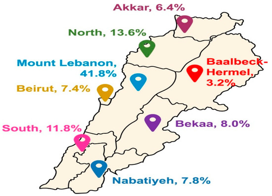 To account for the nonresponse rate and to increase the precision of the estimates, rounding the sample to reach 500 participants was considered, and women from the 8 Lebanese governorates were included. Out of 600 individuals reached, 70 did not respond (11.7% nonresponse rate). The stratified proportional sampling distribution method was used. The process of recruiting participants involved utilizing multiple networks, which included pregnant women identified in private clinics, hospitals, medical centers, and primary health care centers. Gynecologists were cooperative in the initial phases of the study, either by facilitating the process of reaching women and sometimes informing pregnant women about the study and explaining the study objectives or by welcoming the dietitians and agreeing to meet with their patients. Individuals who opted to engage in the study were initially briefed on the nature of the research and subsequently assessed for eligibility. Those who qualified then provided their oral consent, indicating their readiness to participate. Participant distribution across the 8 governorates is shown in Figure 1.
