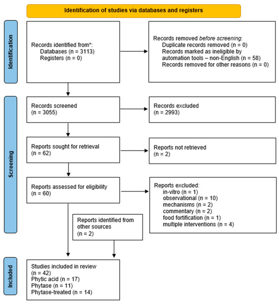 A total of 3113 records were identified, and after filtering for the English language, 3055 articles were yielded. Eligible studies included original articles describing interventions that investigated the absorption of micronutrients following (a) the supplementation of exogenous phytase, (b) the consumption of phytic acid, and (c) the consumption of phytase-treated foods. Animal, in vitro, and cross-sectional studies were excluded. We also excluded studies with double or multiple interventions. A total of 2993 studies were excluded, and 2 others were not available in full text.