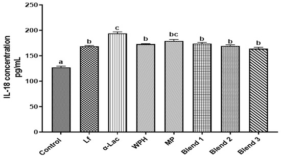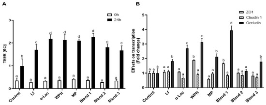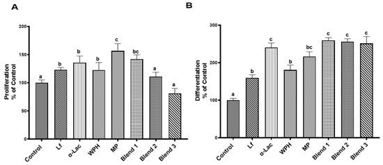 3.4. Effects of Lf, α-Lac, WPH, MP, and Lf–Protein Blends on Proliferation and Differentiation of Intestinal Epithelial Cells