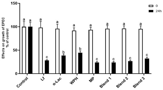 3.8. Effects of Proteins and Protein Blends on Growth of EPEC