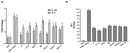 2.12. Effects of Proteins and Lf–Protein Blends on the Inflammatory Response Induced by EPEC Infection: IL-1β, IL-6, and TNF-α