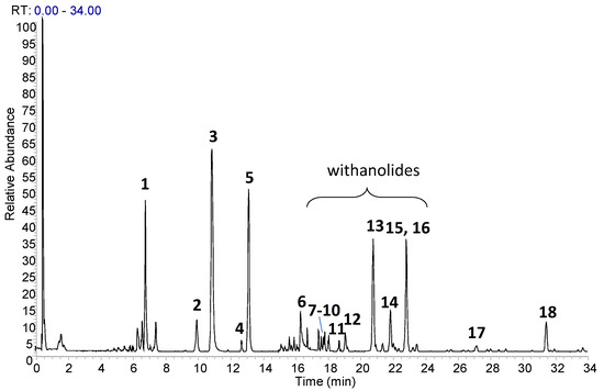 In the present study, an UHPLC-HRMS/MS method for profiling and characterization of constituents present in the ST-65 formulation was developed. The UHPLC conditions were optimized to obtain maximal chromatographic resolution and MS signal. Figure 1 shows representative chromatogram of ST-65 under optimal conditions. HRMS/MS analysis were performed in positive and negative ionization mode to obtain complementary information needed to characterize ST-65 formulation. To avoid repetitions, data have been reported only in positive ionization mode (Table 1) as they show higher response in the detection. Compound assignments were made by HRMS spectra, tandem mass spectrometry experiments and when possible, by comparing MS spectra and retention time with authentic standards, or with chemo-taxonomic data reported in literature. Eighteen (1–18) major peaks were detected in ST-65 formulation, and their retention times and MS data are listed in Table 1. UHPLC-HRMS/MS analysis allowed to identify four flavonoids (3–6), ten withanolides (7–16) and one bacopa saponin (17). Compounds 3, 5 and 6 were ascertained to be rutin, hesperidin and quercetin, respectively, by reference standards. Compound 4 in MS2 spectra showed a base peak at m/z 287.0548 corresponding to the aglycon kaempferol and the characteristic losses of hexose and deoxyhexose residues. Thus, compound 4 could be tentatively identified as kaempferol-hexose-deoxyhexose. Compounds 7–16 were identified as withanolides, 28-carbon steroidal lactones, built up on an intact or rearranged ergostane framework [34]. Their structural chemistry produce limited fragmentation in ESI mass spectra. Therefore, in MS2 spectra, only losses of the sugar units linked to the aglycone were detected. Thus, according MS analysis and literature data [35] the compounds 7–15 could be identified as withanolides reported in Table 1. Compound 17 showed ion at m/z 797.4688 with a molecular formula C42H69O14. It was identified as a Bacopaside N, as the MS2 spectra showed losses of two sugar units from the jujubogenin aglycon [35].