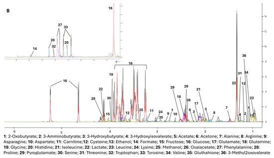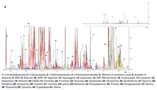 The cytoplasmatic metabolites, produced by cells (endometabolome) and the extracytoplasmatic metabolites (esometabolome) were investigated using 1H-NMR spectroscopy. We performed an untargeted metabolomic analysis on SH-SY-5Y cell cultures treated and untreated with the Bacopa and Ashwagandha formulations called ST-65. Figure 3A,B shows the representative 1D 1H NOESY NMR spectrum of cellular endo and esometabolome, respectively [36]. The spectra were assigned using Chenomx NMR-Suite v8.0 [37], highlighting 41 metabolites in the endometabolome and 36 in the esometabolome. NMRProcFlow was used to quantify the spectra, taking into account the internal standard trimethylsilyl propanoic acid (TSP), the number of H for each peak, and the metabolites’ molecular weight [38]. After quantification, metabolites matrices were analysed using MetaboAnalyst 6.0 by univariate and multivariate supervised approaches.