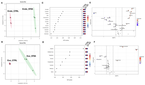 PLS-DA score plots related to the endometabolome (A) and the esometabolome (B) of treated (green) and untreated (red) cells with ST-65 formulation. VIP score graph reported the metabolites responsible for clusters endometabolome (C) and esometabolome cluster separation (D). Volcano plot analysis of metabolic changes in the cellular polar extract of endo (E) and esometabolome (F) of treated and untreated cells. Each point on the volcano plot was based on p-value and fold-change values, set at 0.05 and 2.0, respectively. Red points identify upregulated metabolites, whereas blue points identify down-regulated metabolites.