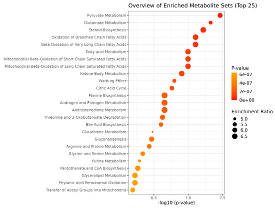 The paths with hits > 1 and p value < 0.05 were considered discriminatory [33] (Figure 5; Table S2). Enrichment revealed that ST-65 impacts several energetic pathways, such as Pyruvate metabolism and the Citric acid Cycle. Furthermore, mitochondrial biochemical pathways related to fatty acids, such as beta-oxidation of short-chain fatty acids in mitochondria, beta-oxidation of long-chain fatty acids, and ketosis body metabolism, are also impacted. Moreover, ST-65 also modulates pathways related to steroid hormone biosynthesis, derived from cholesterol and regulated by gonadotropins, and neurotransmitter amino acids, such as glycine and serine metabolism.
