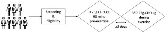 The implications of impaired glucoregulation in those with T1D are most evident when exercise is undertaken within the post-prandial window; hence, the risk of overt hyperinsulinemia and, thus, hypoglycemia, is expedited [3,4,5]. Accordingly, consensus guidelines governed by research studies are now inclusive of automated insulin delivery (AID) systems, advocate pre-exercise low-glycemic-index carbohydrate intake matched with reductions in bolus insulin as prudent exercise management strategies to support glycemic control [4,6,7,8,9,10,11]. However, while our understanding of how the type of carbohydrate ingested around exercise affects glucose is fairly comprehensive [9,12], far less is known about how alterations in the timing of their consumption influence glucose metabolism in those with T1D, particularly against the background of the newest generation of insulin delivery systems. The purported advantages of ingesting carbohydrates during endurance exercise have mainly been narrowed down to the associated exercise performance benefits brought about by the maintenance of blood glucose concentrations and higher rates of carbohydrate oxidation [13]. However, in the context of clinical cohorts, perhaps greater than those pertaining to sports performance are the potential benefits of carbohydrate feeding during exercise for metabolic control.