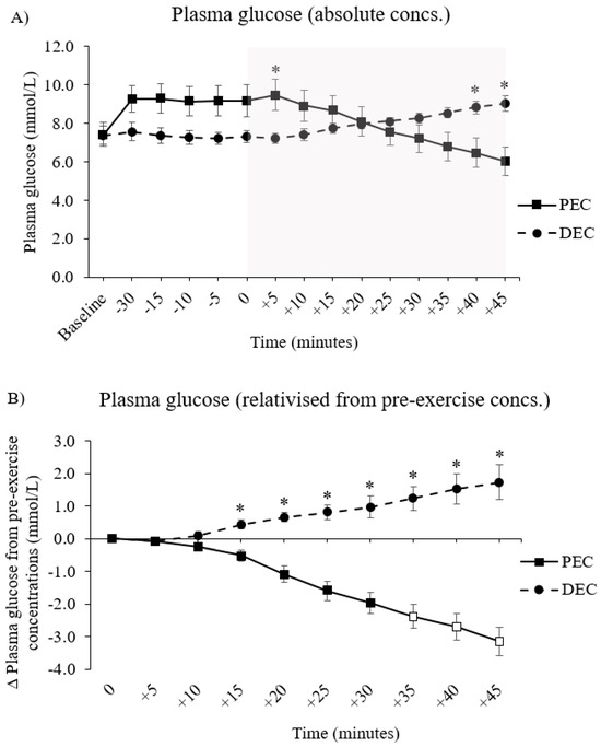 Relative to those concentrations measured immediately at the start of exercise, the PG concentrations had decreased significantly by the final 15 min of cycling in the PEC group, i.e., at minute 35 (∆ − 2.4 ± 1.1 mmol/L, p = 0.051), 40 (∆ − 2.8 ± 1.2 mmol/L, p = 0.041), and 45 (∆ − 3.2 ± 1.3 mmol/L, p = 0.028). Within-condition changes from the pre-exercise values are denoted by the white blocked markers in Figure 2, panel B. Conversely, there were no changes in PG from pre-exercise concentrations at any time point during exercise in the DEC group.