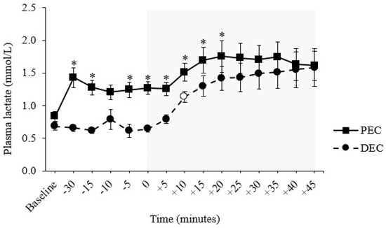 Plasma lactate responses across each experimental trial arm. PEC refers to the trial arm in which the carbohydrate solution was consumed as one full serving, equating to 0.75g/kg/bm, 90 min prior to exercise commencement. DEC refers to the trial arm in which the carbohydrate solution was consumed in three isocaloric, isovolumic servings at the start (0 min), mid-point (+20 min), and toward the end (+40 min) of exercise. * Denotes a significant difference (p ≤ 0.05) in the point concentration of a parameter between the two trial arms. White markers denote a significant difference (p ≤ 0.05) in the point concentration of a parameter relative to the respective trial arm baseline value. The gray-shaded area denotes the time frame in which participants undertook a 45-min bout of moderate-intensity continuous exercise, programmed to be at ≈60% of their individualized V̇O2peak. Data are presented as the mean ± SEM.