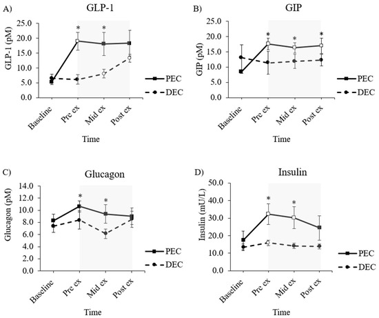 Gut peptide (A,B) and pancreatic (C,D) hormone responses across each experimental trial visit. PEC refers to the trial arm in which the carbohydrate solution was consumed as one full serving, equating to 0.75 g·kg·bm, 90 min prior to exercise commencement. DEC refers to the trial arm in which the carbohydrate solution was consumed in three isocaloric, isovolumic servings at the start (0 min), mid-point (+20 min), and toward the end (+40 min) of exercise. * Denotes a significant difference (p ≤ 0.05) in the point concentration of a parameter between the two trial arms. White markers denote a significant difference (p ≤ 0.05) in the point concentration of a parameter relative to the respective trial arm baseline value. The gray-shaded area denotes the time frame in which participants undertook the 45-min bout of moderate-intensity continuous exercise, programmed to be at ≈60% of their individualized V̇O2peak. Data are presented as the mean ± SEM.