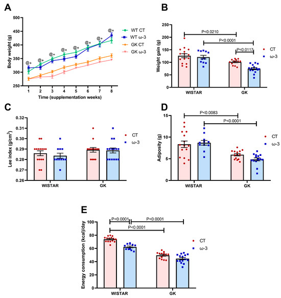 Evaluation of body weight during the 8 weeks of the experiment (A), body weight gain (final–initial) (B), Lee Index (C), adiposity (D), and energy consumption (Kcal/day) (E). WT CT, (n = 15); WT ω-3, (n = 11); GK CT, (n = 14); and GK ω-3 (n = 15). + p < 0.05 GK CT vs. WT CT; @ p < 0.05 GK ω-3 vs. WT ω-3. The results are expressed as the means ± standard errors of the means (SEM). WT, Wistar; CT, control; GK, Goto-Kakizaki.