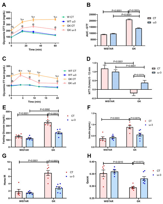 Glucose tolerance test (GTT) (A), the area under the GTT curve (B), insulin tolerance test (ITT) (C), glucose decay constant for ITT (kITT) (D), fasting blood glucose (E), insulin (F), Homa-IR Index (G), and QUICKI Index (H). For tests A, B, C, and D, we used WT CT, (n = 15); WT ω-3, (n = 11); GK CT (n = 14); and GK ω-3 (n = 15). For test E, we used Wistar CT, (n = 6); Wistar ω-3, (n = 6); GK CT, (n = 6); and GK ω-3 (n = 6). For tests F, G, and H, we used Wistar CT, (n = 6); Wistar ω-3, (n = 6); GK CT, (n = 7); and GK ω-3 (n = 7). + p < 0.05 GK CT vs. Wistar CT, @ p < 0.05 GK ω-3 vs. Wistar ω-3, % GK ω-3 vs. GK CT. The results are expressed as the means ± standard errors of the means (SEM). AUC, Area under curve. WT, Wistar; CT, control; GK, Goto-Kakizaki; HOMA, homeostatic model assessment; kITT, insulin tolerance test rate constant.