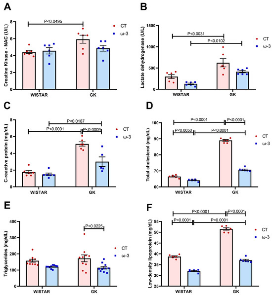 The activities of serum creatine kinase were higher in the GK CT than in the WT CT group animals (Figure 3A). Lactate dehydrogenase serum activity was enhanced in the GK group compared to the WT group (Figure 3B). CRP levels were elevated in the GK group compared to the WT group, and ω-3 fatty acid supplementation reduced them in GK rats (Figure 3C).