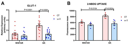 The T lymphocytes of the control GK animals showed an increased expression of GLUT-1 compared to the WT CT and ω-3-supplemented GK groups (Figure 4A). The GK control T lymphocytes exhibited an increased 2-NBDG fluorescence mean compared to the WT CT and GK ω-3 groups (Figure 4B). These data indicate that glucose consumption by lymphocytes was augmented in GK rats but was abolished by ω-3 fatty acid supplementation. The representative histograms of the 2-NBDG uptake analysis are presented in S3.