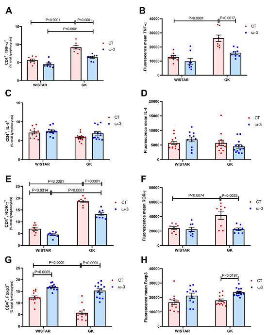 Figure 5. The cells were stimulated with PMA and ionomycin for 12 h to evaluate the T lymphocyte phenotype using flow cytometry. (A) Th1 percentage (CD4+TNF-α+ cells); (B) TNF-α fluorescence mean; (C) Th2 percentage (CD4+IL-4+); (D) IL-4 fluorescence mean; Th17 percentage (CD4+ROR-γ+ cells) (E); (F) ROR-γ fluorescence mean; (G) Treg percentage (CD4+FOXP-3+ cells); (H) FOXP-3 Fluorescence mean. For tests A, B, E, and F, we used Wistar CT, (n = 8); Wistar ω-3, (n = 8); GK CT, (n = 8); and GK ω-3, (n = 8). For tests C, D, G, and H, we used Wistar CT, (n = 13); Wistar ω-3, (n = 11); GK CT, (n = 13); and GK ω-3, (n = 13). The results are expressed as the means ± standard errors of the means (SEM). PMA, 12 h with phorbol myristate acetate; CT, control; GK, Goto-Kakizaki; FOXP3, Forkhead box P3; ROR-γ, RAR-related orphan receptor-γ; TNF-α, tumor necrosis factor-α; CD, Cluster of Differentiation. - Th2 lymphocytes: There were no remarkable variations in the percentage of CD4+ IL-4+ cells or the mean fluorescence intensity related to IL-4 (Figure 5C,D).