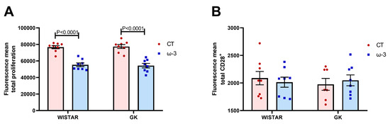 Proliferative capacity of the lymphocytes stimulated with concanavalin A (A). CD28+ expression (B). For the analysis of cell proliferation, T lymphocytes were stimulated with 5 μg/mL concanavalin A and incubated with 5 μM BrdU for 48 h. Statistical analysis of the mean fluorescence intensity is shown in B. Wistar CT, (n = 8); Wistar ω-3, (n = 8); GK CT (n = 8); and GK ω-3, (n = 8). The results are expressed as the means ± standard errors of the means (SEM). CT, control; GK, Goto-Kakizaki; CD, Cluster of Differentiation.